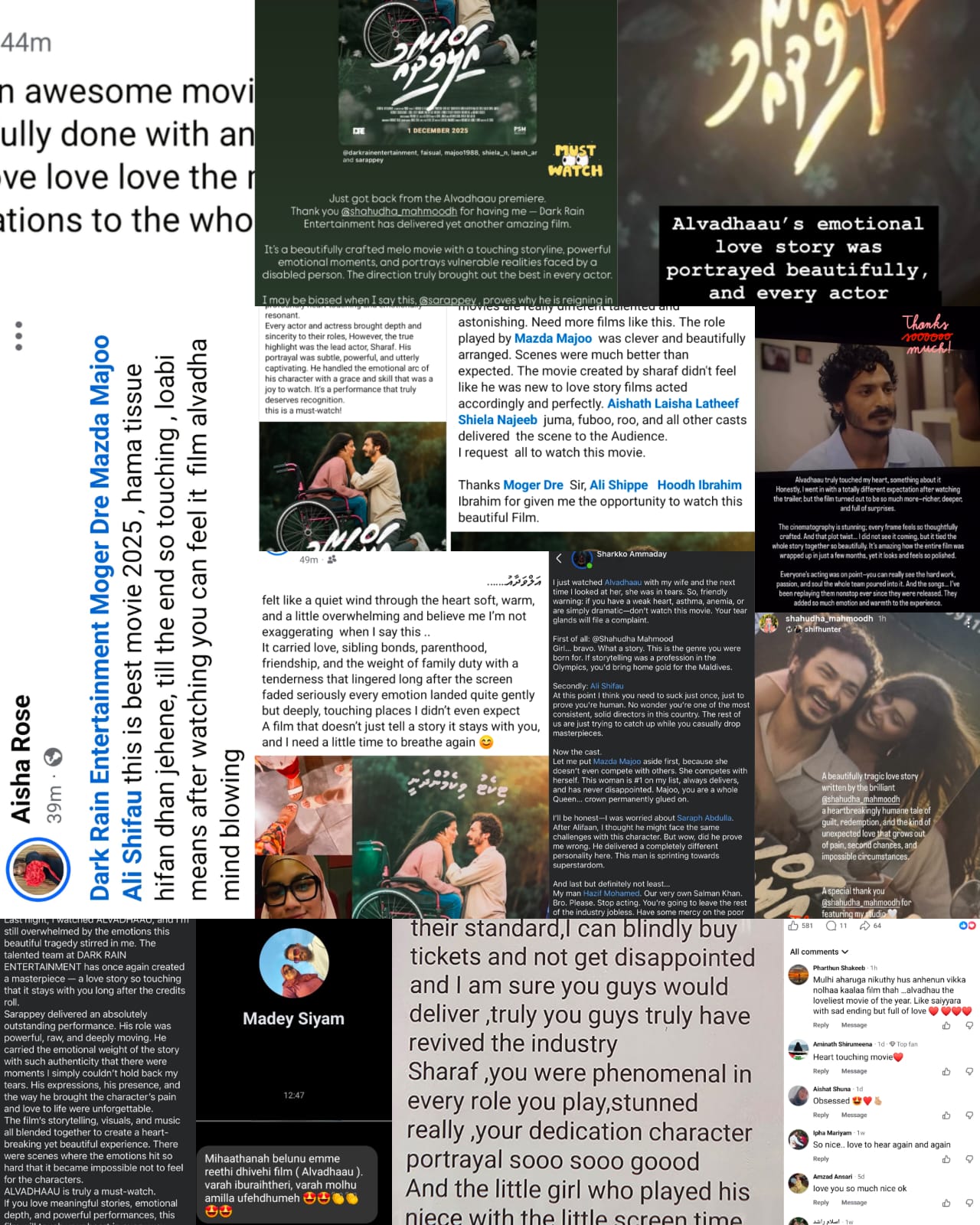 ޑާކް ރެއިން އެންޓަޓެއިންމަންޓުން އުފައްދާފައިވާ މިއަހަރުގެ އެންމެ ފަހުގެ ފިލްމު "އަލްވަދާޢު" މިހާރު އޮލިޕަހުގެ ސްކްރީނުގައި ދައްކަމުން އަންނަ އިރު މިފިލްމަށް އޮތް ތަރުހީބު ބޮޑުކަން ފާހަގަވެއެވެ. ސޯޝަލް މީޑިއާ ބަލާލުމުން ފާހަގަވަނީ މިފިލްމު ބަލާކޮންމެ ބެލެންތެރިއެއްވެސް ފިލްމާއިމެދު ބުނެފައިވަނީ މިއީ މޮޅު ރީތި އަދި ހިތަށް އަސަރުކުރުވި ފިލްމެއްކަމުގައެވެ. އާންމުކޮށް ދިވެހި ފިލްމު ބަލާ ނޫޅޭ ފަރާތްތަކުންވެސް ވަނީ މިފިލްމު ބެލުމަށްފަހު މިމަސައްކަތަކީ ޑާކްރެއިން ޓީމުން ގެނެސްދިން ފުރިހަމަ މަސައްކަތެއްކަން ފާހަގަކޮށްފައެވެ.